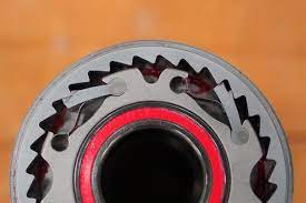 Dans le fonctionnement de la roue, il y a également le corps de roue libre. Il est composé de l’un des 2 systèmes suivants : soit un roulement à cliquets comme les moyeux Hed, soit un roulement incluant une couronne crantée et une bague filetée comme les moyeux DT Swiss.