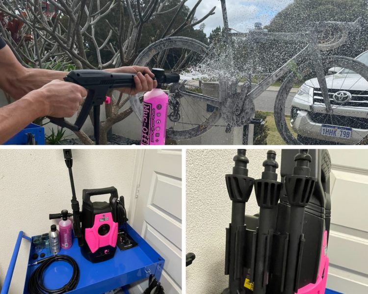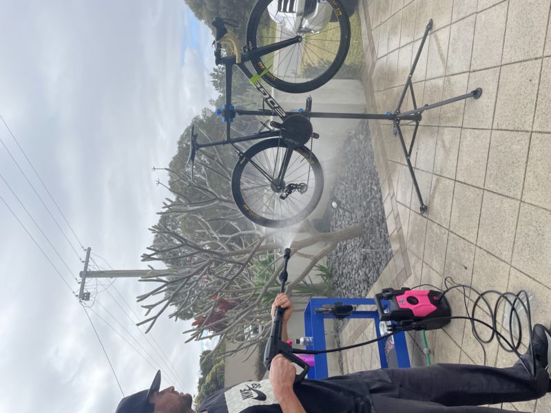 Nous ne pouvons aussi que vous conseiller de porter des lunettes de protection. Il faut aussi veiller à ne pas déconnecter des extensions lorsque l’appareil est sous pression. Muc Off recommande de ne pas utiliser de corde de rallonge électrique si possible. Si les 5m de cordon électrique ne suffisent pas, pensez à en utiliser un qui est comptible avec l’utilisation en zone humide. Pour éviter les glissades, il est recommandé d’utiliser le nettoyeur haute pression dans un endroit où le drainage est efficace. Enfin, pour éviter les blessures, il est préférable de tenir la lance à deux mains. Pour ma part, j’ai opté pour un support vélo qui permet de faire tourner le vélo sur son axe. Cela me permet de rester au même endroit et c’est le vélo qui tourne.