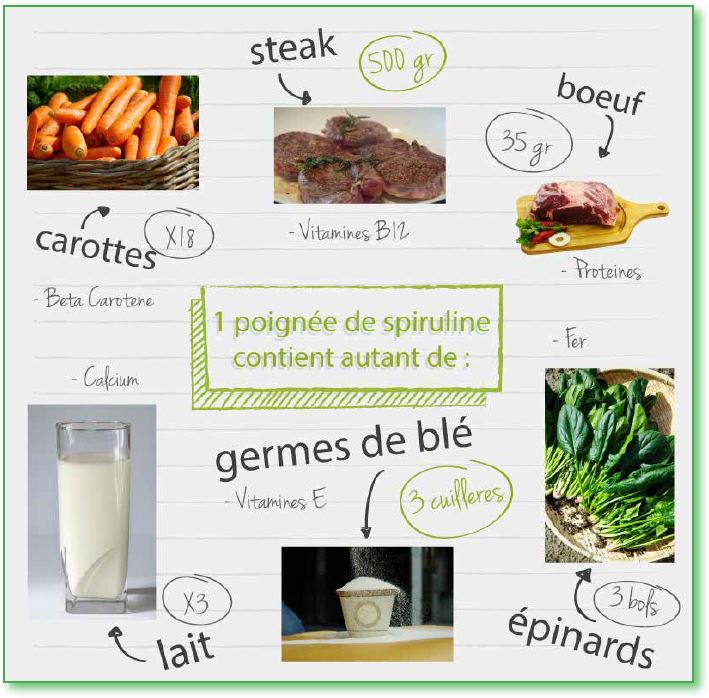 La spiruline est très riches en protéines. Celles-ci sont d’excellentes qualité car elles contiennent 8 acides aminés dont l’organisme a besoin pour bien fonctionner. Ce type de protéines ne se trouvent généralement pas dans les produits d’origine végétale hormis dans les micro-algues. Ces protéines couplées à ces oligo-éléments permettraient de renforcer le système immunitaire et présenterait des vertus contre le cancer intéressantes selon certaines études en plus de ses vertus antivirales liées à la stimulation de notre système immunitaire.