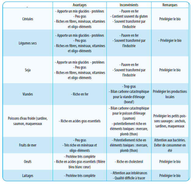 - Consommer des protéines tous les jours à raison de 1.5-2 g par kg de poids corporel en veillant à diversifier les apports ; pour assurer un équilibre optimal, il est recommandé de consommer 50% de protéines animales (oeuf, poisson, viande, laitages) pour 50% de protéines végétales (céréales, légumes secs, soja…).
