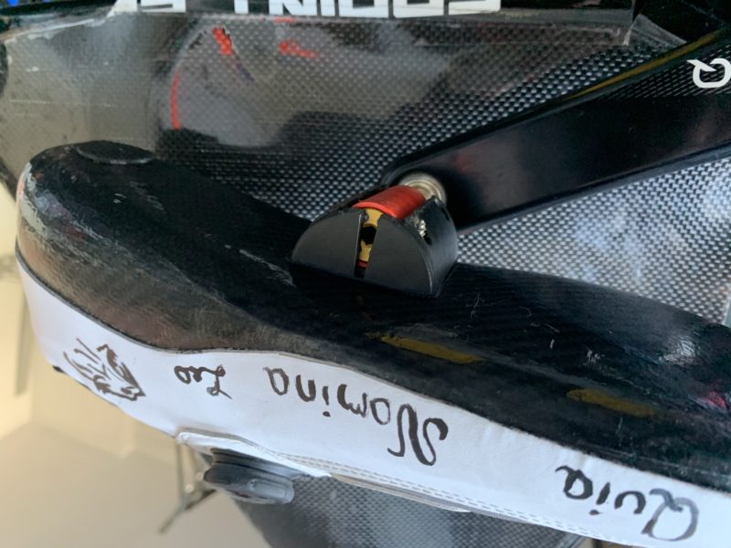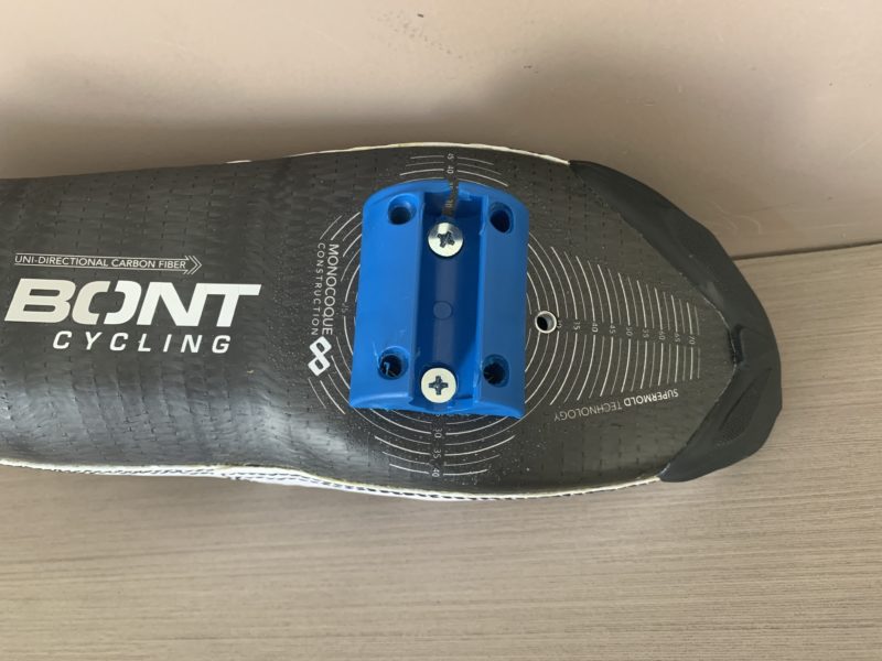 C’est là la grande nouveauté et sûrement là où la plupart des membres de la communauté vont hésiter à franchir le pas. En effet, les cales à 4 trous de chez Aerolite ne facilitent pas la tâche quand il s’agit d’installer les cales. Comme ce ne sont pas des standards, il faut utiliser les vis fournies et littéralement percer dans les semelles en nylon ou en carbone. Une fois l’opération de perçage réussie, il faut s’assurer que la surface est plane et que l’angle choisi est le bon. Sinon, il faut recommencer l’opération de perçage… Aerolite insiste sur le fait qu’il n’y a aucun problème à percer même les semelles en carbone, et nous l’avons testé avec un ensemble qui est photographié ci-dessous. Par ailleurs, les cales ont 2 trous au fond, qui permettent d’utiliser les 2 trous proximaux des chaussures du marché dotées de 3 trous. Ce mécanisme à 2 trous s’est révélé efficace pour la rétention des cales. Le point négatif est que l’emplacement est dépendant des chaussures.
