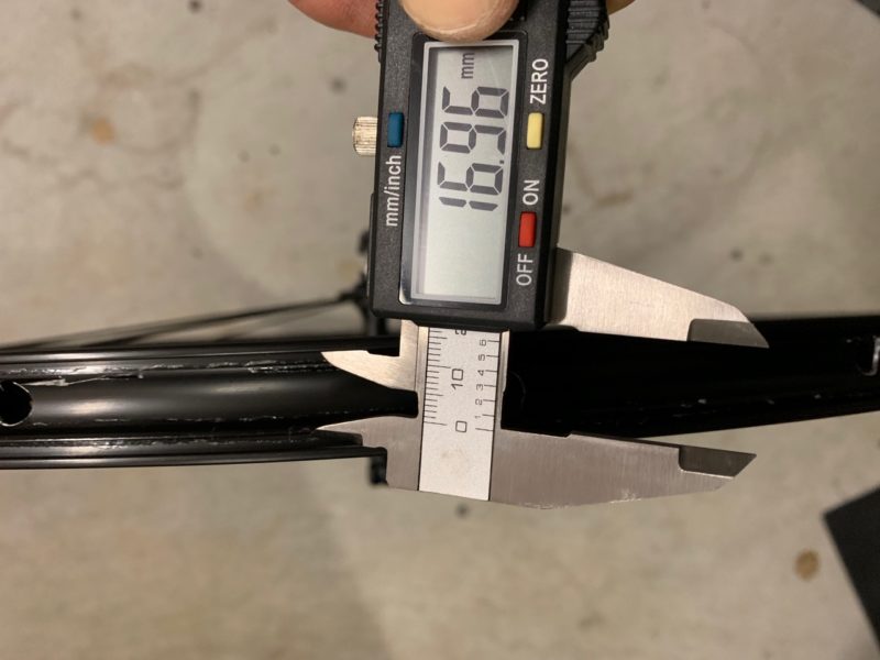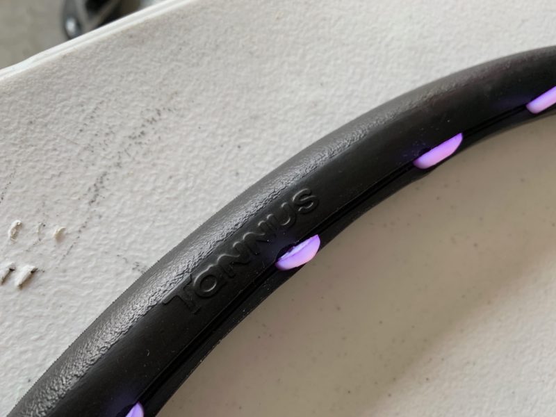 J’ai mesuré la largeur de ma jante intérieure (17 mm) et pris en considération le fait qu’il fallait des goupilles d’environ 3,5 mm plus longues. Après avoir testé chacune des trois broches pour déterminer celle qui s’adapte le mieux à ma jante, j’ai installé les goupilles violettes de 21 mm et j’ai commencé à les insérer dans les pneus. Chaque pneu nécessite 40 goupilles. Mais ce n’est pas difficile avec leur outil pour pousser la goupille. Tannus inclut aussi quelques goupilles en plus, au cas où vous en perdriez pendant le montage ou si vous en cassiez une. Les pneus étant livrés serrés, il faut donc les “pré-étirer” pour aider au montage. Après cela, il faut verrouiller les goupilles en place.