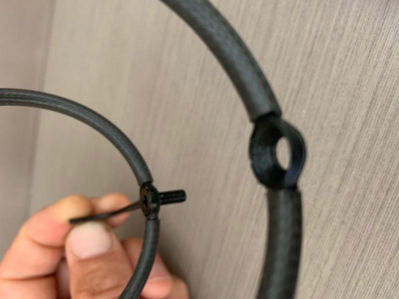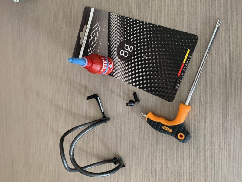 Il vous faudra utiliser une clé Torx T25. Par ailleurs, le fabricant recommande une pression de serrage avec une clé dynamométrique de l’ordre de 2 N m. Ce n’est pas beaucoup et il est donc ainsi prudent d’ajouter un peu de frein filet. Loctite est l’un des leaders dans ce domaine et le frein filet « moyen » est idéal. Les vis ont des têtes coniques qui viennent parfaitement se placer contre les 2 trous insérés dans les bras du porte-bidon.