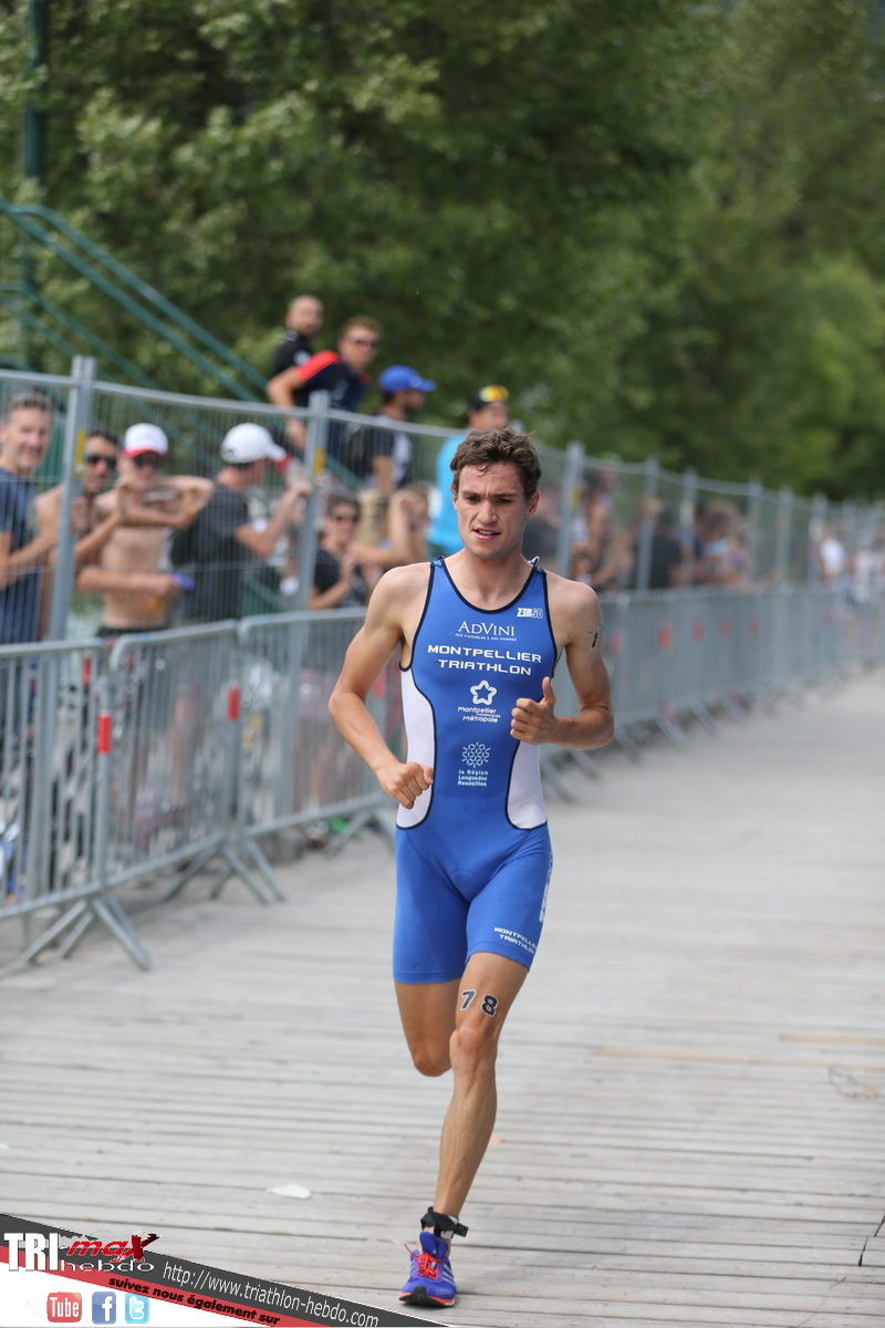 « Dès le début de la natation, je suis à gauche de Javier Gomez jusqu’à la première bouée où un autre compétiteur, qui alors se trouve dans les pieds de Gomez, perd contact avec l’espagnol. Le temps que je le double et le trou est fait. Zut! Je sors de l’eau avec 38s de retard et démarre le vélo en 3ème position.