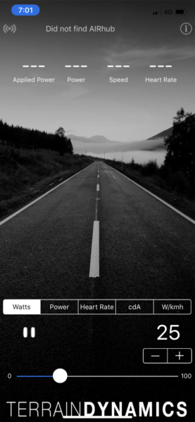 - Mode “Power” et mode “Heart rate” : permettent de travailler par exemple à un seuil que vous choisissez (entre 150 et 500 watts; et entre 100 et 171 pulsations/min). Dès que la puissance ou la fréquence cardiaque descendent en dessous de la valeur souhaitée, le Airhub entre en jeu et accroît la résistance.