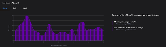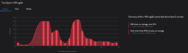 Enfin, l’application détecte aussi les pics de glycémie (les « glucose rush »), pics qui correspondent à une hausse de plus de 10 mg/dL dans une période de 5 minutes. Plus il y a de variations soudaines à la hausse, plus cela contraint votre corps à réguler en sécrétant de l’insuline. La succession de “rushs” peut créer un état pro-inflammatoire délétère.