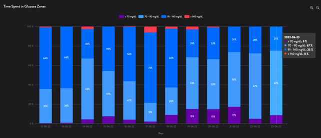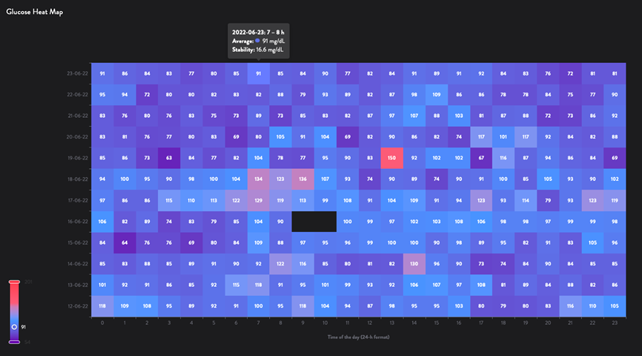 L’information de base donnée par le capteur est la glycémie, en mg de glucose par dL de sang. Cette donnée fluctue généralement entre 50 et 180 au gré de ce que l’on mange et de l’activité physique que l’on a. Cela peut beaucoup varier au cours de la journée, et c’est très spécifique à chaque individu. En effet, 2 athlètes qui absorbent le même repas peuvent avoir des réponses glycémiques complètement différentes !