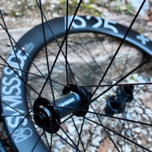 Les moyeux sur cette version sont des DT Swiss 370, version custom pour Swiss Side. Légèrement plus lourds que la version 240 faisant référence depuis des années, les DT Swiss 370 n’en sont pas moins un gage de qualité et fiabilité tout en permettant de réduire la facture finale. Le standard de freinage disque est du Centerlock. En option il est possible de convertir les axes du standard Thru Axle 12mm vers du quick release 5mmx135mm. Différents adaptateurs sont disponibles chez DT swiss nous ayant par exemple permis de tester les roues également sur un vélo gravel (axe avant de 15mm).