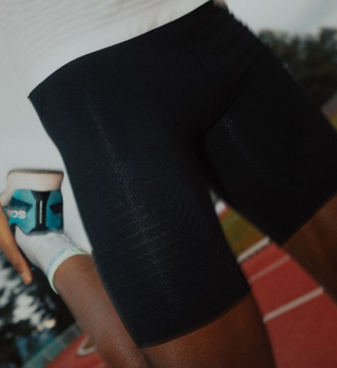 À l’arrière des cuisses, le tissage gaufré horizontal sur les ischio-jambiers stimule la microcirculation et le flux lymphatique, contribuant à l’activation musculaire et au retard de la fatigue.
