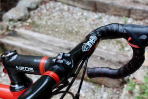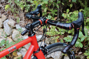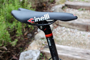 Cintre, potence et tige de selle sont issus de la série NEOS de chez Cinelli. Le tout complète parfaitement l’ensemble en proposant un montage cohérent. Le cintre est en carbone et adopte une forme très ergonomique autant sur la partie haute que basse. Chacun y verra ses préférences, mais à nouveau il est tout à fait cohérent de privilégier le confort pour le montage d’un cadre acier.