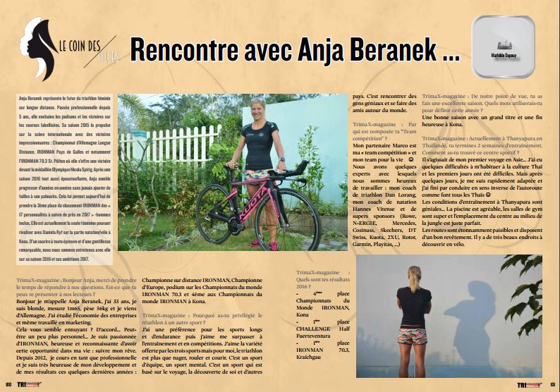 Anja Beranek représente le futur du triathlon féminin sur longue distance. Passée professionnelle depuis 5 ans, elle enchaine les podiums et les victoires sur les courses labellisées. Sa saison 2015 la propulse sur la scène internationale avec des victoires impressionnantes : Championnat d’Allemagne Longue Distance, IRONMAN Pays de Galles et notamment l’IRONMAN 70.3 St. Pölten où elle s’offre une victoire devant la médaillée Olympique Nicola Spirig. Après une saison 2016 tout aussi époustouflante, Anja semble progresser d’années en années sans jamais ajouter de failles à son palmarès. Cela lui permet aujourd’hui de prendre la 3ème place du classement IRONMAN des « 17 personnalités à suivre de près en 2017 » -hommes inclus. Elle est actuellement la seule féminine pouvant rivaliser avec Daniela Ryf sur la partie natation/vélo à Kona. D’un sourire à toute épreuve et d’une gentillesse remarquable, nous nous sommes entretenus avec elle sur sa saison 2016 et ses ambitions 2017.