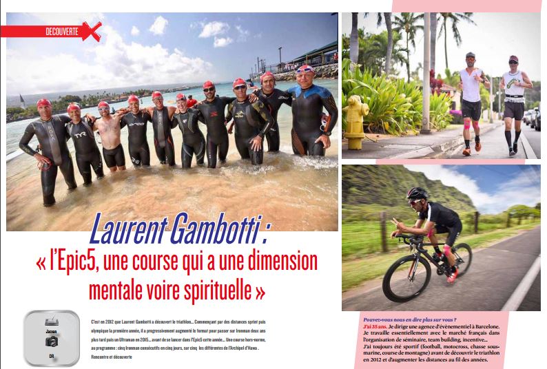 C’est en 2012 que Laurent Gambotti a découvert le triathlon… Commençant par des distances sprint puis olympique la première année, il a progressivement augmenté le format pour passer sur Ironman deux ans plus tard puis un Ultraman en 2015… avant de se lancer dans l’Epic5 cette année… Une course hors-norme, au programme : cinq Ironman consécutifs en cinq jours, sur cinq îles différentes de l’Archipel d’Hawaï. Rencontre et découverte
